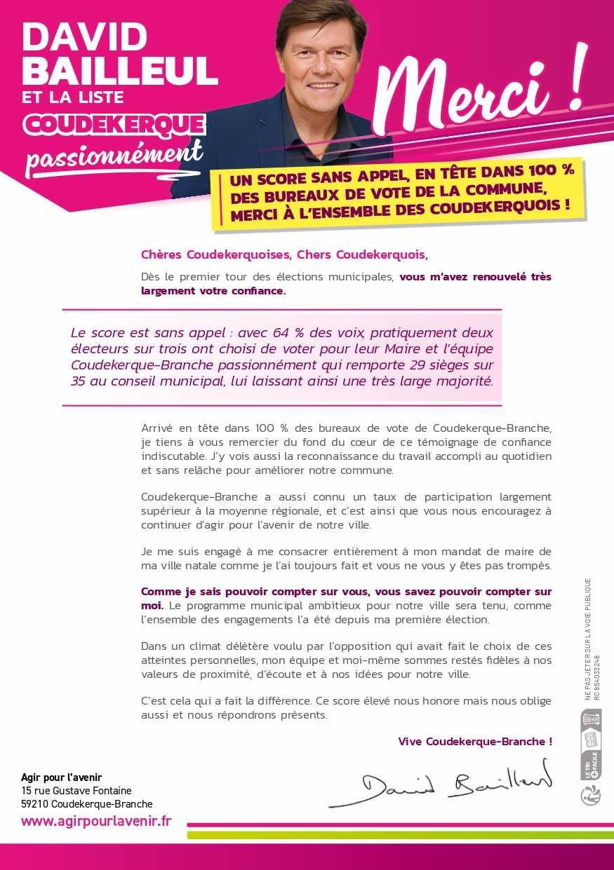 Presque deux tiers des voix pour ma liste Coudekerque passionnément, victorieux dans la TOTALITÉ des bureaux de vote de Coudekerque branche ( 17/ 17 le grand chelem !) une majorité municipale de 29 élus sur 35 !!!!!! Les Coudekerquois ont apporté la plus belle des réponses aux détracteurs de Coudekerque ! Parce que comme vous [...]