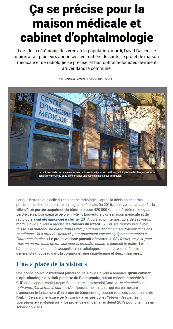 Lisez l’article de la Voix du nord vous verrez que la maison médicale et le retour d’un radiologue en centre ville est toujours d’actualité avec en plus un second projet dans un second temps d’installation d’ophtalmologues en ville. Bien vu Coudekerque-Branche.