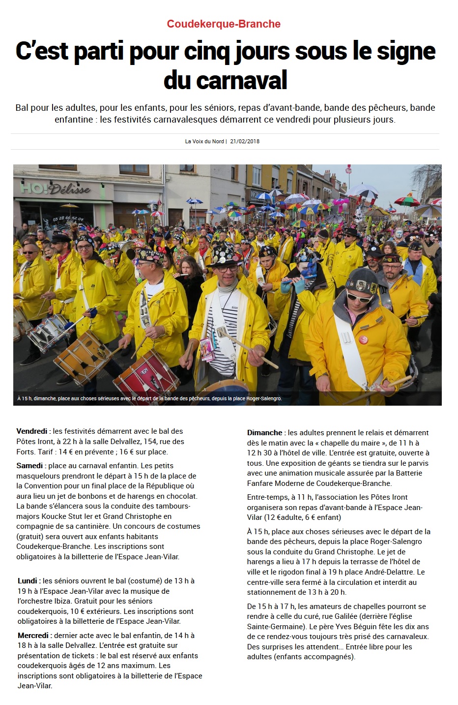 Publié le: 23 février, 2018Catégories : Dans la presseVues: 830Mots clés: article, carnaval, chansons, coudekerque-branche, coudekerquois, cuivres, david bailleul, enfants, espace jean vilar, festivités, festivités carnavalesques, fête, habitants, maire, mairie, solidarité, tambours, Voix du Nord