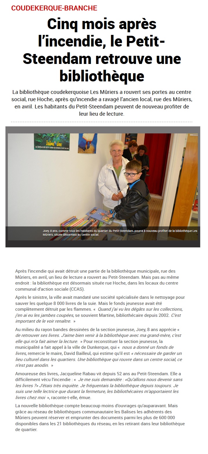 Publié le: 13 septembre, 2017Catégories : Dans la presseVues: 1282Mots clés: bibliothèque, centre social, coudekerque-branche, coudekerquois, cud, david bailleul, élus, enfants, habitants, Inauguration, incendie, lecture, livres, maire, mairie, Petit Steendam, services municipaux, solidarité, Voix du Nord