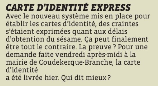 Cocorico ! Et un compliment de la part du quotidien local du jeudi 25 mai sur le système performant que nous avons mis en place à la ville du fait de la refonte de la carte d’identité ( désormais de nombreuses villes ne peuvent plus instruire les demandes et délivrer les cartes d’identité ).