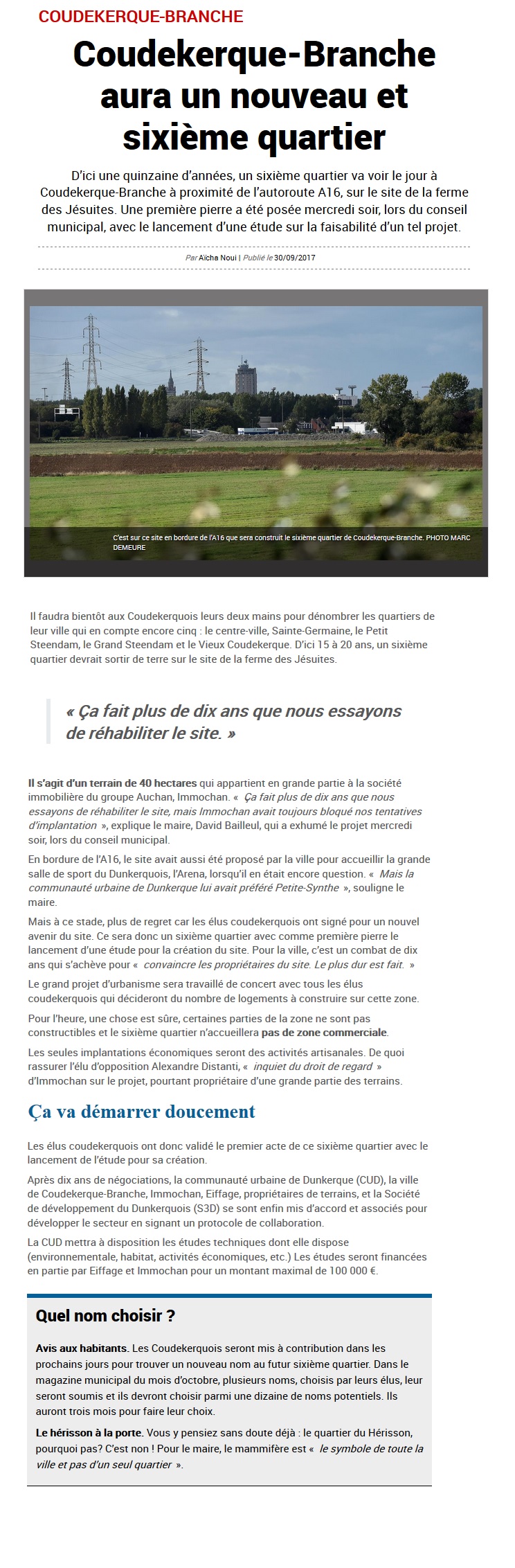 Comme le dit la Voix du Nord bien sûr que vous pourrez décider du nom du 6ème quartier en devenir ( le terme de « la ferme aux jésuites » n’étant que le nom du document de travail ). Vous aurez la parole dans le prochain magazine municipal et sur internet car j’ai voulu que sur un sujet important, la création d’un sixième quartier, la population soit concertée.
