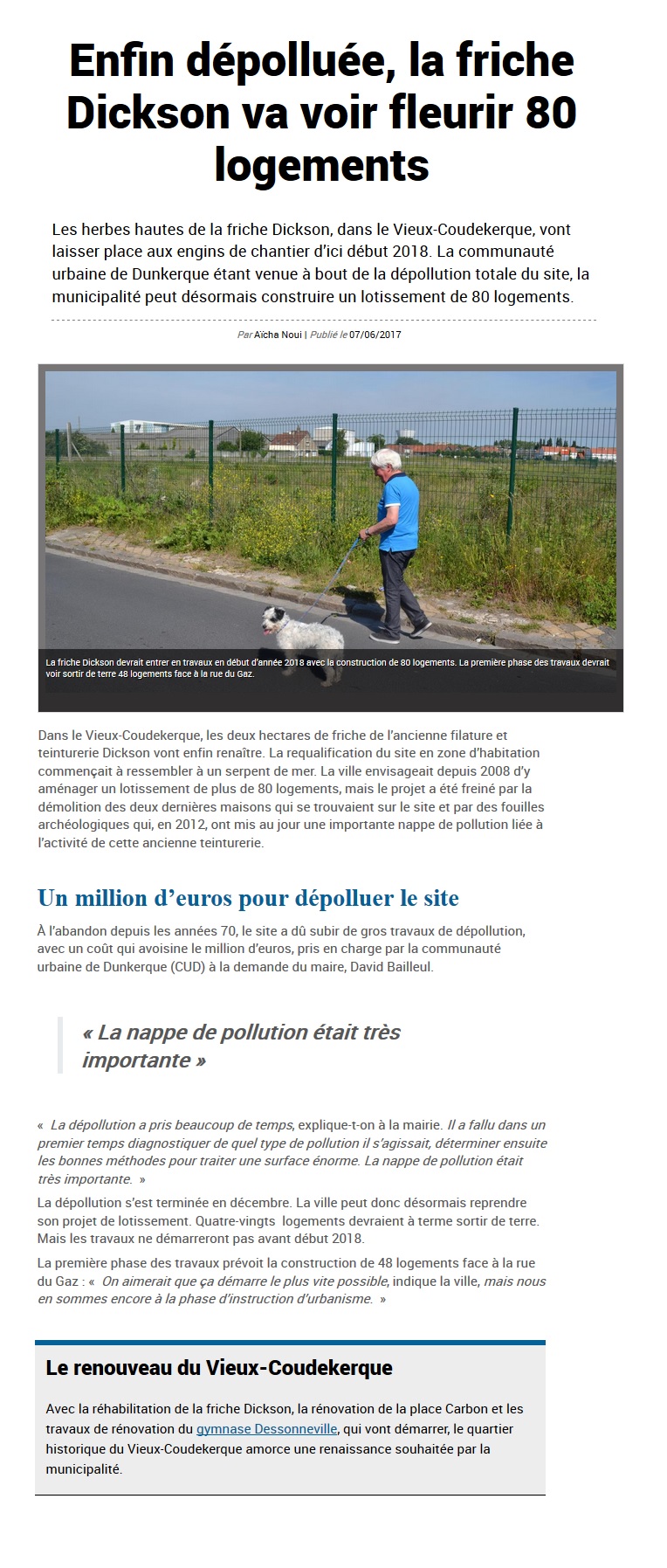 À force d’y croire : comme j’ai déjà eu l’occasion de l’évoquer la dépollution de l’ancienne friche Dickson dans le Vieux Coudekerque est achevée et on va donc pouvoir enfin redonner du lustre au secteur avec la construction dès début 2018 d’un lotissement et dès cet été la construction de la salle de gymnastique ( qui se trouve au bout du terrain du futur lotissement ).