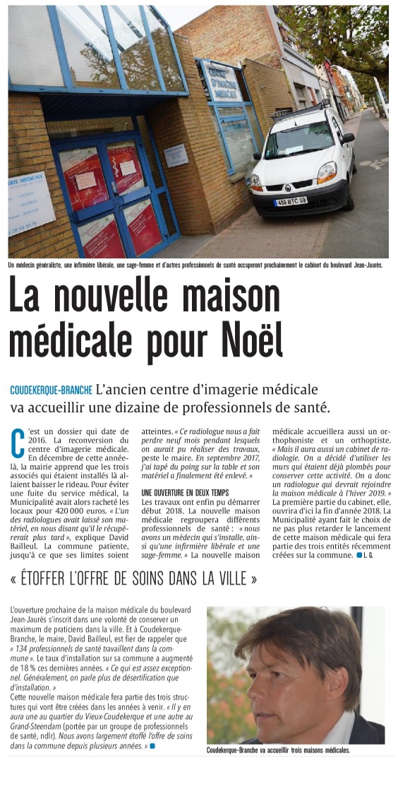 Grand article dans la presse locale qui revient sur la maison médicale ( pas celle dont on a parlé il y a quelques jours qui va ouvrir au Grand Steendam mais la seconde, une nouvelle ) que la ville porte en lieu et place de l’ancien cabinet de radiologie privé qui avait fermé ses portes.