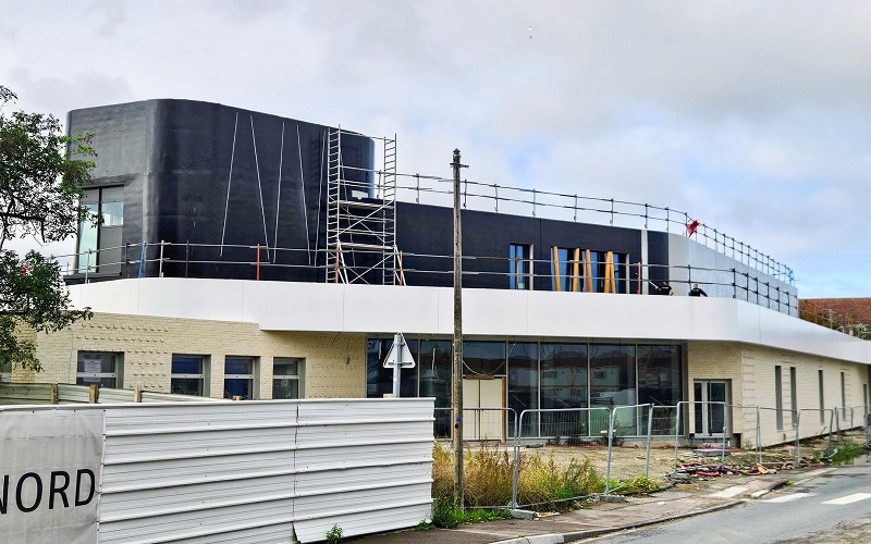 Le revêtement extérieur sur la partie haute de la piscine est en cours d’achèvement, tout comme la pose des derniers toboggans extérieurs.