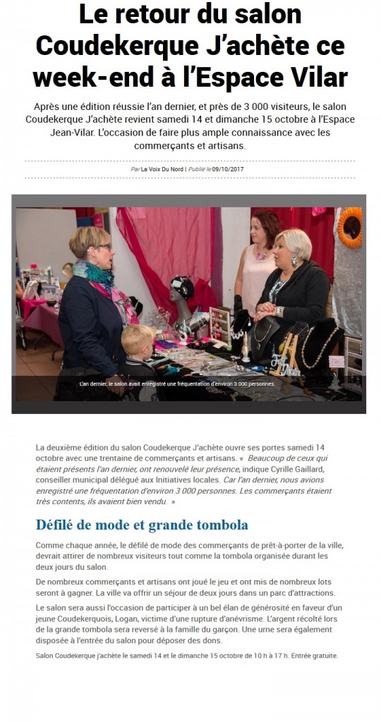 Avec cet article de la Voix du Nord, vous avez toute les infos pour venir au salon des commerçants locaux  » Coudekerque j’achète  » et de gagner un lot à la tombola. Pour ma part, j’y serai ce samedi en milieu après midi après avoir réalisé ma balade urbaine auprès des habitants du Grand Steendam.