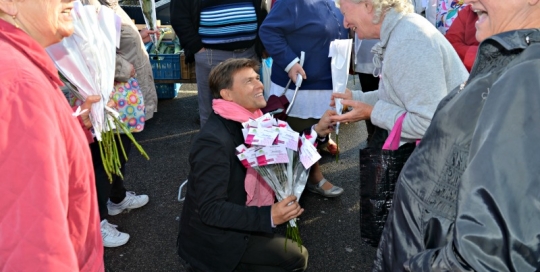 Distribution de roses sur le marché afin de sensibiliser au dépistage du cancer du sein