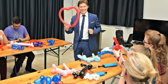 Le 18 juin 2016 – David Bailleul lors de sa visite à l’atelier de l’école de magie qui forme des animateurs des centres de loisirs de Coudekerque-Branche à la sculpture de ballons.
