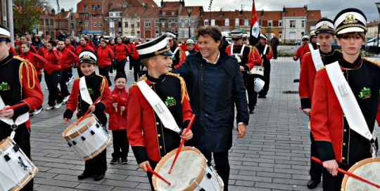 Le 22 novembre 2015 – David Bailleul entouré par les musiciens de la batterie fanfare moderne lors de la Sainte Cécile à l’espace Jean Vilar de Coudekerque-Branche.