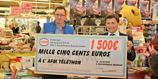 Le 13 décembre 2015 – David Bailleul lors de la remise du chèque par le directeur dans la galerie marchande de l’hypermarché Cora de Coudekerque-Branche au profit du Téléthon 2015.