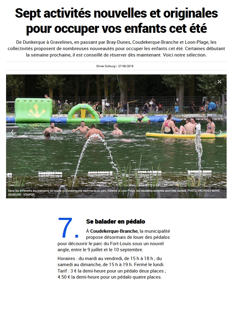 Dans les 7 nouveautés de l’été pour s’amuser sur l’ensemble du littoral, la voix du nord a retenu notre belle initiative au parc du Fort Louis pour découvrir le parc au fil de l’eau au travers des pédalos dans les douves.