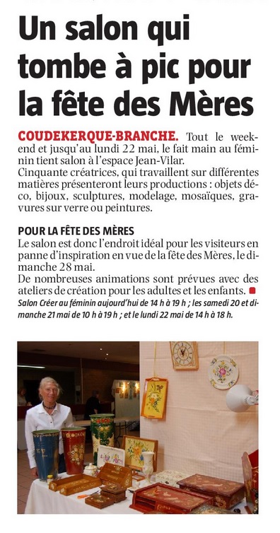En manque d’inspiration pour le cadeau de la fête des mères ? L’association créer au féminin vous apporte la solution avec tous le week-end ainsi que la semaine prochaine l’exposition de nombreux exposants dans ce que l’on a coutume de dénommer le » fait main » à l’espace Jean Vilar.